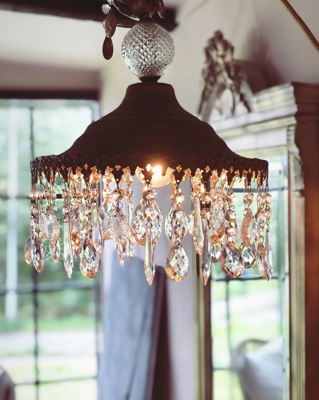 Min aller første investering i atelieret. Skreddersydd og satt i stand av et lite familieverksted i Spania (Etsy). Håndlaget rundt midten av forrige århundre. Alle deler av lysekronen er autentiske og komplette - og fullstendig vakre! En chandelier som ble smykket i atelieret.